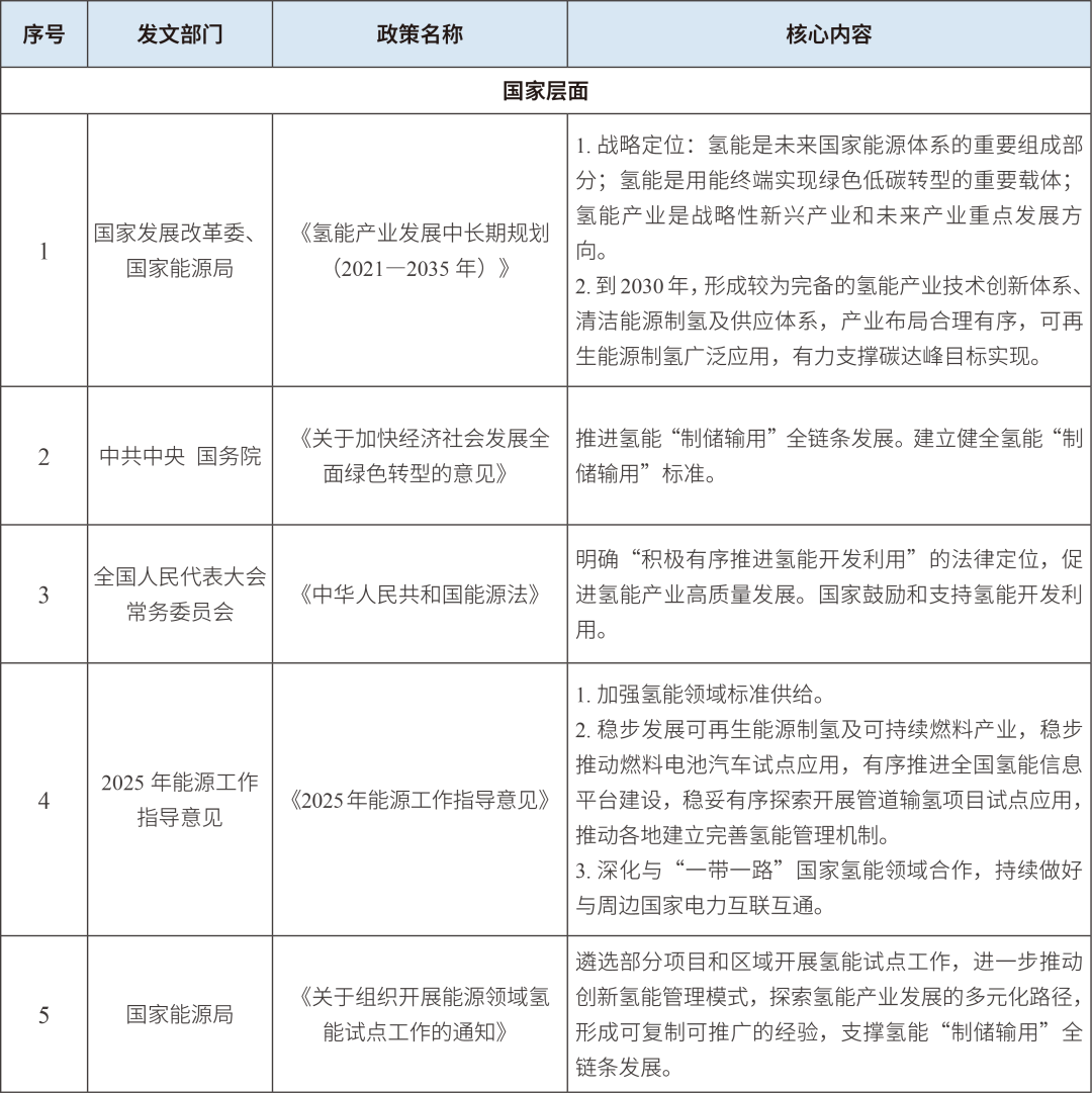 我國對氫能產業發展的戰略部署和政策支持體系正在持續完善,已形成多層次、全方位的產業促進機制。《氫能產業發展中長期規劃(2021—2035年)》首次從戰略高度明確了氫能的能源屬性和產業定位。在2024年政府工作報告中,氫能首次以“前沿新興產業”的定位被納入。2025年1月1日施行的能源法,正式明確了“積極有序推進氫能開發利用”的法律定位;開始遴選部分項目和區域開展氫能試點工作,探索氫能產業發展的多元化路徑。