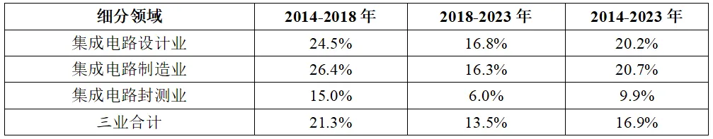表2 2014-2023年我國集成電路產(chǎn)業(yè)三大主業(yè)銷售收入年均復(fù)合增速情況