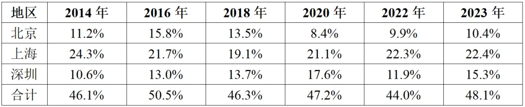 表6 2014-2023年北京、上海、深圳集成電路設(shè)計、制造、封測三大主業(yè)銷售收入占全國比重情況