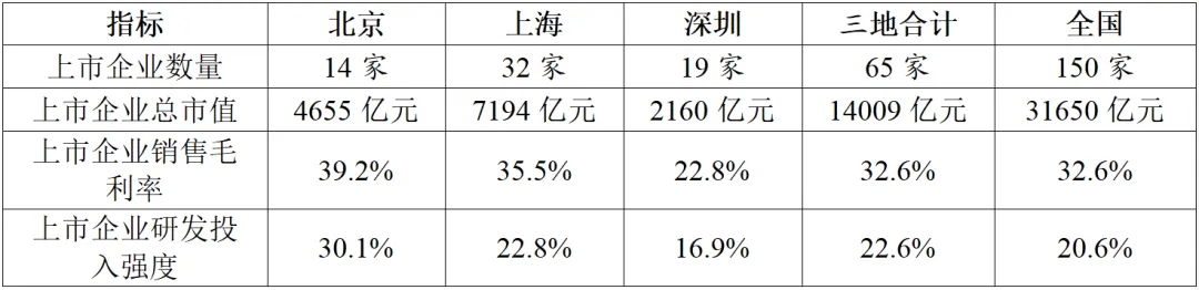 在企業(yè)發(fā)展方面,北京上市企業(yè)發(fā)展質(zhì)量最高,上海上市企業(yè)數(shù)量和總市值最多。根據(jù)東方財富數(shù)據(jù)(表7),截止到2023年底,北京、上海、深圳分別擁有14家、32家、19家半導(dǎo)體領(lǐng)域的上市企業(yè),總市值分別為4655億元、7194億元、2160億元,合計上市企業(yè)數(shù)量和總市值占到全國的40%以上。其中上海上市企業(yè)的數(shù)量和總市值最多,而北京的上市企業(yè)發(fā)展質(zhì)量最高,銷售毛利率和研發(fā)投入強度分別達到39.2%和30.1%,遠超全國平均水平。