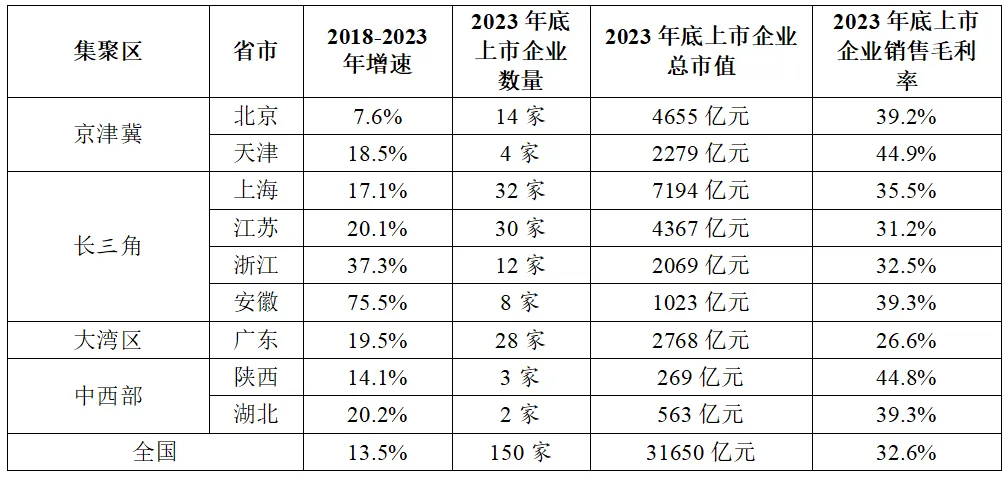 從企業(yè)發(fā)展來看,京津冀和中西部上市企業(yè)發(fā)展較為優(yōu)質(zhì),中西部上市企業(yè)數(shù)量和總市值仍有上升空間。根據(jù)東方財富數(shù)據(jù)(表9),截止到2023年底,在我國150家半導(dǎo)體上市企業(yè)中,82家來自長三角地區(qū),占比接近一半,總市值占比也接近一半。而京津冀和中西部上市企業(yè)的銷售毛利率遠超國內(nèi)全行業(yè)上市企業(yè)平均水平,企業(yè)質(zhì)量較為優(yōu)質(zhì)。但中西部地區(qū)的上市企業(yè)數(shù)量和總市值與其他地區(qū)存在較為明顯的斷層差距,仍存在一定的上升空間。