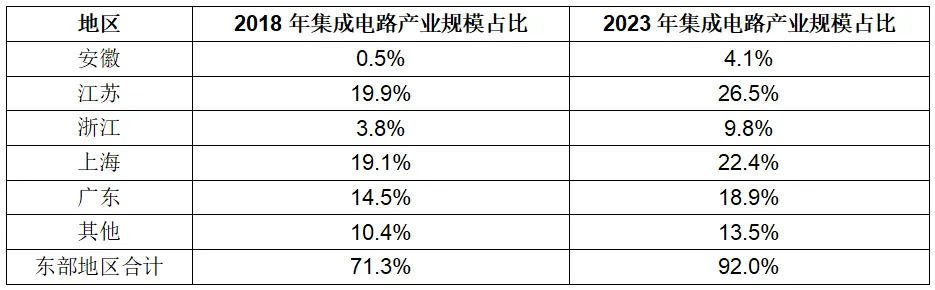 表1 2018-2023年我國東部地區集成電路產業規模占全國比重