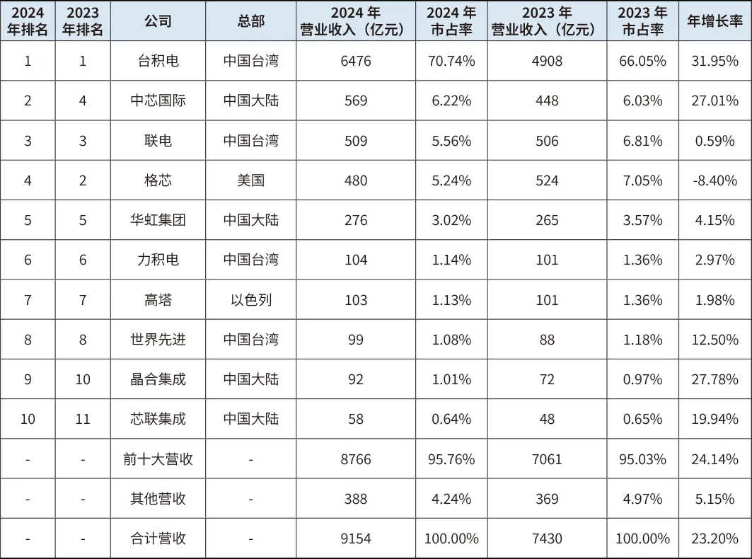表1 2023年、2024年全球前十大純集成電路制造代工企業