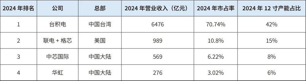 表5 2024年中美及中國臺灣各集成電路代工企業12寸代工產能占比