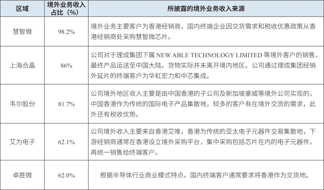 在我國160余家集成電路上市企業中,部分境外業務收入占比較高的企業在年報中披露,其境外業務客戶主要以中國香港地區子公司或貿易公司為主,最終采購方仍為中國大陸客戶,是以出口轉內銷為主的“假出海”現象。企業將其收入“境外化”的主要原因在于可利用香港的稅制優勢降低產品整體稅負,此外香港地區作為傳統的國際電子產品集散地,較多客戶也有在境外交貨的需求。