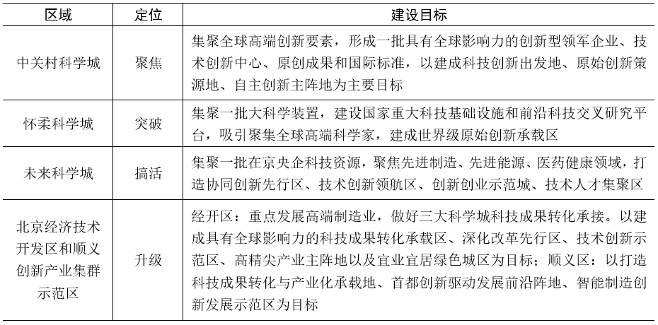 當(dāng)前我國面臨錯綜復(fù)雜的國際形勢,國際科技創(chuàng)新合作面臨巨大挑戰(zhàn)。“三城一區(qū)”作為國際科技交流與合作的承載地、國際科技創(chuàng)新中心建設(shè)的主平臺,科技創(chuàng)新資源高度集聚,政策疊加優(yōu)勢尤為突出,加快推動“三城一區(qū)”統(tǒng)籌聯(lián)動和融合發(fā)展,促進各區(qū)優(yōu)勢互補,強化創(chuàng)新鏈、產(chǎn)業(yè)鏈和供應(yīng)鏈協(xié)同共生,對北京建設(shè)科技創(chuàng)新之城、爭先競逐世界高地意義重大。本文將從“三城一區(qū)”融合聯(lián)動發(fā)展現(xiàn)狀入手,剖析融合聯(lián)動發(fā)展存在的問題,并研提對策建議,以期為推動“三城一區(qū)”融合聯(lián)動向縱深發(fā)展提供支撐。 一、“三城一區(qū)”融合聯(lián)動成效初顯,問題仍存 目前,“三城一區(qū)”融合聯(lián)動發(fā)展取得初步成效,協(xié)調(diào)對接機制初步形成、聯(lián)動發(fā)展分工定位逐步明確、社會組織驅(qū)動聯(lián)動合作日益增多,但仍然存在頂層設(shè)計亟需優(yōu)化、協(xié)調(diào)力度有待提升、優(yōu)勢互補尚未達成、協(xié)同創(chuàng)新合作不足等諸多問題。 (一)組織架構(gòu)搭建完成,運行機制尚待優(yōu)化 為支撐北京國際科技創(chuàng)新中心建設(shè),北京市設(shè)立“一處七辦”[1]組織架構(gòu),北京推進科技創(chuàng)新中心建設(shè)辦公室秘書處(以下簡稱“北京辦公室秘書處”)負責(zé)北京辦公室日常工作,7個專項辦各司其職,負責(zé)具體推進各專項工作,覆蓋重大科技戰(zhàn)略落實、政策創(chuàng)新改革、科技人才建設(shè)等重點領(lǐng)域,涵蓋“三城一區(qū)”科技創(chuàng)新主平臺。但由于“一處七辦”缺乏實體領(lǐng)導(dǎo)機構(gòu),專項辦主要依托相關(guān)市屬委辦局、各區(qū)政府工作體系運轉(zhuǎn),凝聚力有待加強。 (二)協(xié)調(diào)機制初步建立,協(xié)調(diào)力度有待提升 北京辦公室秘書處牽頭建立了協(xié)調(diào)會議機制,包括周例會、季度調(diào)度會及半年度調(diào)度會等形式,為“三城一區(qū)”搭建了溝通交流平臺。“三大科學(xué)城”與“一區(qū)”簽訂戰(zhàn)略合作協(xié)議,各單位相應(yīng)建立工作專班或領(lǐng)導(dǎo)小組,初步探索建立了聯(lián)動發(fā)展機制。但“三城一區(qū)”尚無市級層面領(lǐng)導(dǎo)機構(gòu),聯(lián)動層級不夠,工作協(xié)調(diào)力度不足,不能有效地解決“三城一區(qū)”融合聯(lián)動發(fā)展中出現(xiàn)的深層次問題。 (三)聯(lián)動分工初步明確,優(yōu)勢互補尚未達成 北京市根據(jù)“三城一區(qū)”創(chuàng)新資源、產(chǎn)業(yè)特點、發(fā)展方向等方面,明確了“三城一區(qū)”具體發(fā)展定位及建設(shè)目標(biāo)(見表1),但“三城一區(qū)”融合水平尚需提升,目前并未在聯(lián)動基礎(chǔ)上充分發(fā)揮“三城一區(qū)”各自的優(yōu)勢力量,創(chuàng)新鏈、產(chǎn)業(yè)鏈難以形成有效銜接,創(chuàng)新資源優(yōu)勢尚未充分轉(zhuǎn)化為產(chǎn)業(yè)優(yōu)勢。 表1 北京市“三城一區(qū)”各區(qū)域規(guī)劃發(fā)展定位