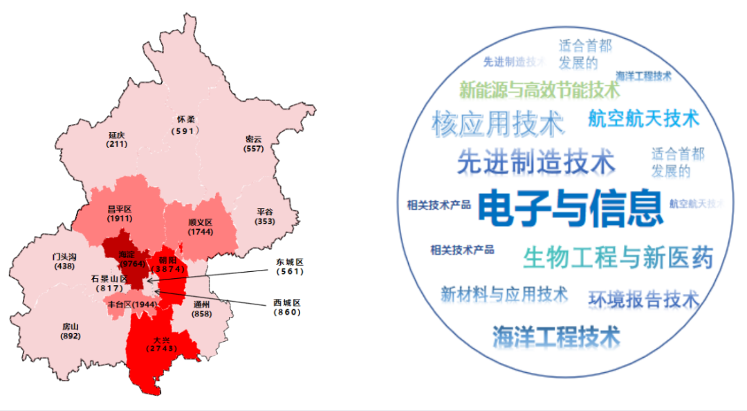 圖1 北京各區高新技術企業數量以及產業領域分布