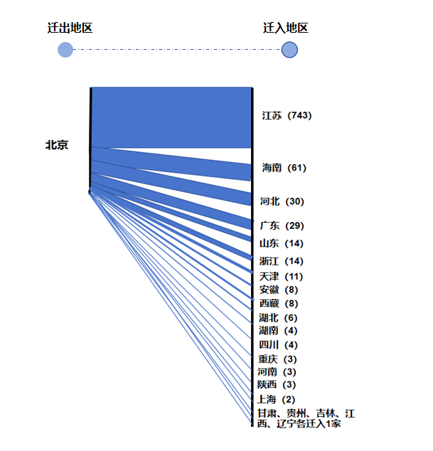 據相關統計,2016年以來,共有948家國家高新技術企業遷出北京市2。其中,83.12%的企業選擇遷往長三角、珠三角等地區,選擇留在津冀的企業僅占4%。其中,江蘇省成為最受歡迎的省份,遷入企業數量高達743家(49.78%),南京、徐州、蘇州成為遷入企業數量最多的城市。除此之外,海南省也吸引了61家北京高新技術企業,外遷時間集中在2020-2021年期間。