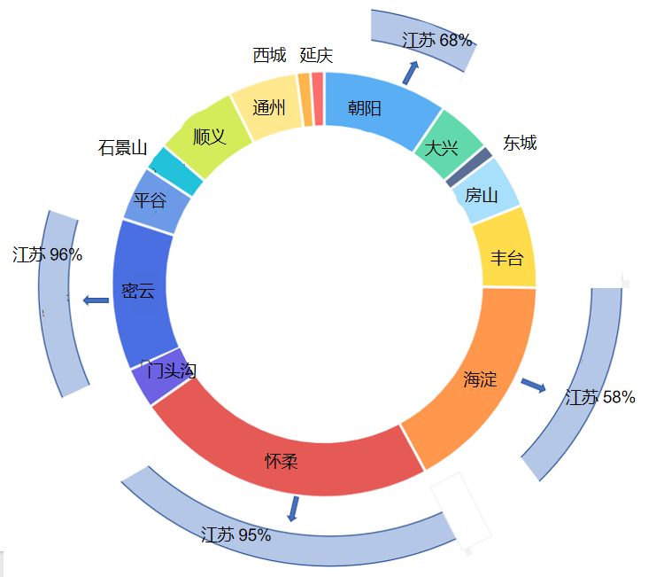 從北京各區高新技術企業的外遷情況來看,懷柔區、海淀區、密云區和朝陽區外遷企業數量最多,其中懷柔區、密云區存量高新技術企業數量本身較少,不足600家,但外遷數量卻位于各區前兩位,首位是懷柔區,近7年來有200家高新技術企業外遷;其次是密云區有100余家高新技術企業外遷,95%以上的外遷企業都選擇前往江蘇省。