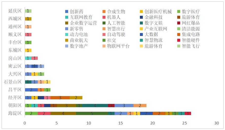 從賽道分布看,2022年北京市獨角獸企業分布于新零售、企業數字運營、人工智能、數字文娛、集成電路、數字醫療等27個賽道,數字經濟、平臺經濟較為發達。其中,數字經濟、人工智能等賽道的獨角獸企業主要分布于海淀區和朝陽區,集成電路、商業航天等賽道的獨角獸企業分布于經開區和朝陽區。