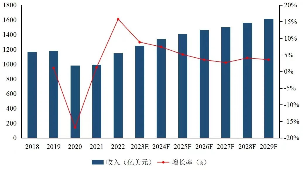 根據(jù)第三方機(jī)構(gòu)整理和預(yù)測,在全球范圍,2022年全球航空維修市場規(guī)模為1149.27億美元,預(yù)測到2029年將達(dá)到1616.73億美元,2023年到2029年復(fù)合增長率約4.37%。在全國層面,近幾年,中國航空維修產(chǎn)業(yè)得到了蓬勃發(fā)展,航空維修市場規(guī)模從2018年的94.37億美元增長到2022年的109.95億美元。預(yù)測2023年到2029年年復(fù)合增長率約6%,航空維修產(chǎn)業(yè)迎來穩(wěn)步增長階段。