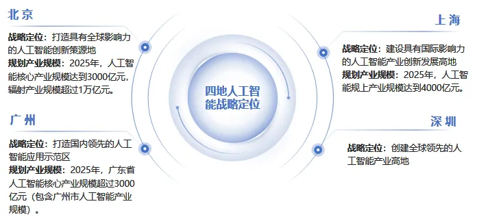 北上廣深四地均將發展人工智能作為重要戰略,聚焦打造國內領先、國際一流的人工智能產業高地,通過政策體系引領,推動人工智能高質量發展、各領域全方位應用。北京市致力打造具有全球影響力的人工智能創新策源地,規劃2025年人工智能核心產業規模突破3000億元,帶動形成超萬億元的產業規模。上海市聚焦構筑具有國際影響力的人工智能產業創新發展高地,規劃到2025年實現4000億元的人工智能規上產業規模。廣州市旨在建設國內領先的人工智能應用示范區。深圳市積極打造全球領先的人工智能產業高地,努力創建人工智能先鋒城市。