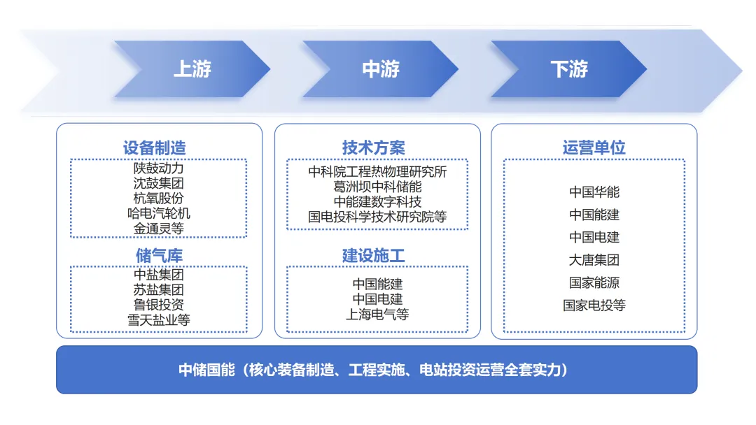 壓縮空氣儲(chǔ)能產(chǎn)業(yè)鏈長(zhǎng)、覆蓋廣,上游產(chǎn)業(yè)為設(shè)備制造和儲(chǔ)氣庫(kù),中游為技術(shù)提供及工程建設(shè)方,下游為投資運(yùn)營(yíng)商(業(yè)主單位),目前在研發(fā)和制造等核心環(huán)節(jié)無(wú)卡點(diǎn),基本實(shí)現(xiàn)全環(huán)節(jié)國(guó)產(chǎn)化。