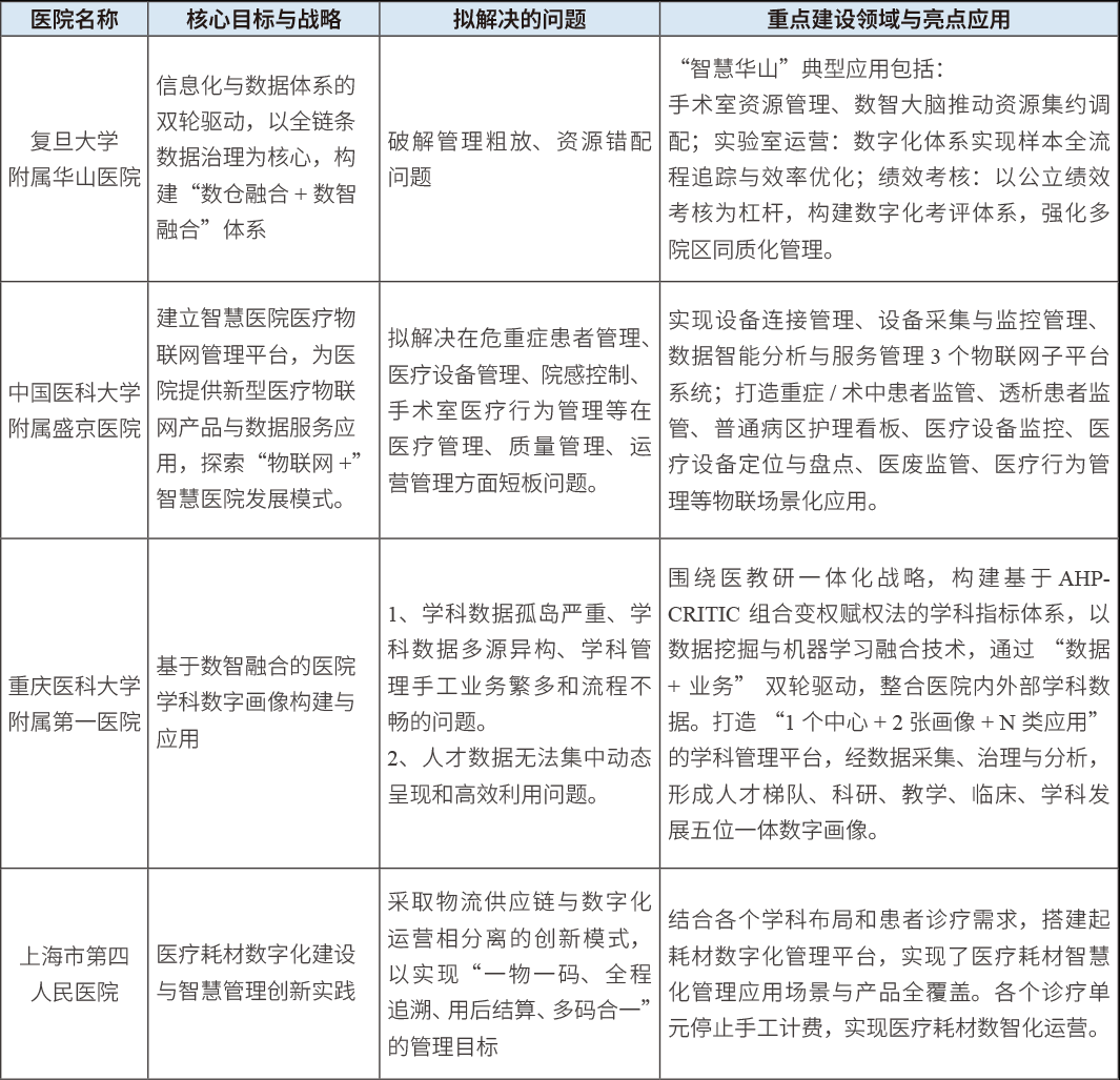 當(dāng)前,部分醫(yī)院根據(jù)發(fā)展需要制定了數(shù)智化轉(zhuǎn)型的目標(biāo),圍繞醫(yī)療資源管理、醫(yī)教研一體化積極探索,取得了一定成效。