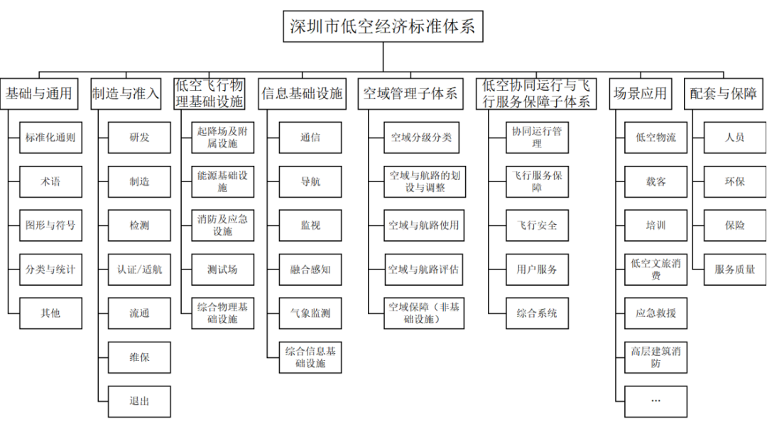 二是制定標準體系框架推動低空物流規范化發展。2024年8月,深圳成立了全國首個地方級低空經濟標準化技術委員會,同年12月發布了《深圳市低空經濟標準體系建設指南1.0》,從基礎與通用、制造與準入、低空飛行物理基礎設施、信息基礎設施、空域管理、低空協同運行與飛行服務保障、場景應用、配套與保障8個角度規劃了深圳低空經濟標準體系框架,為后續低空經濟系統性發展提供了依據。