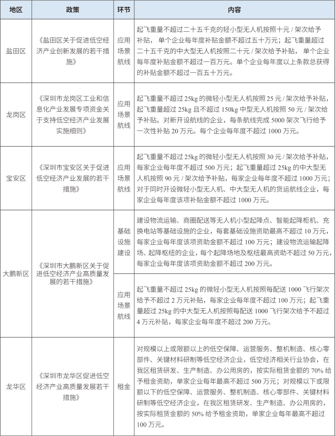 一是謀劃低空經濟頂層設計。作為經濟特區,深圳充分發揮獨立立法權出臺了《深圳市民用無人機管理暫行辦法(征求意見稿)》等政策法規,從民用無人機管理、適航認證、通航協調等方面為無人機物流發展提供立法保障。深圳市通過設立專項資金、給予建設與運營補貼、貼息貸款等方式為無人機相關企業提供資金支持;對于新入駐各區低空產業園區的企業,提供租金補貼,吸引核心零部件企業落地生產。