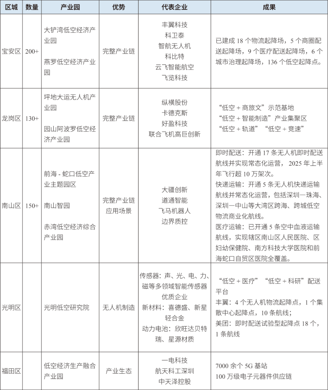 深圳是我國無人機產業集聚度最高的地區,各區依托各自產業基礎及優勢差異化布局開展低空經濟產業。光明區依托光明科學城在信息、生命及新材料方面的優勢,發展無人機大模型訓練、高性能芯片以及新型材料等,重點布局無人機制造領域。福田區成立全國首個“低空經濟生態融合產業園”并依托“中國電子第一街”華強北打造“熱帶雨林”創新創業生態,落地全國首家全產業鏈無人機設備選品中心,聚集200多家物流企業,年交易額超2000億元。南山區設立三個低空經濟產業園,分別專注航空器維修等低空業態、產業鏈優勢企業及無人機產品測驗,同時不斷開拓應用場景,在即時配送、快遞運輸及醫療運輸等方面形成了常態化運營。鹽田區及大鵬新區主要布局eVTOL產業,成立了全國第一個eVTOL產業園區,建設了全國首個融合空域運行示范基地。