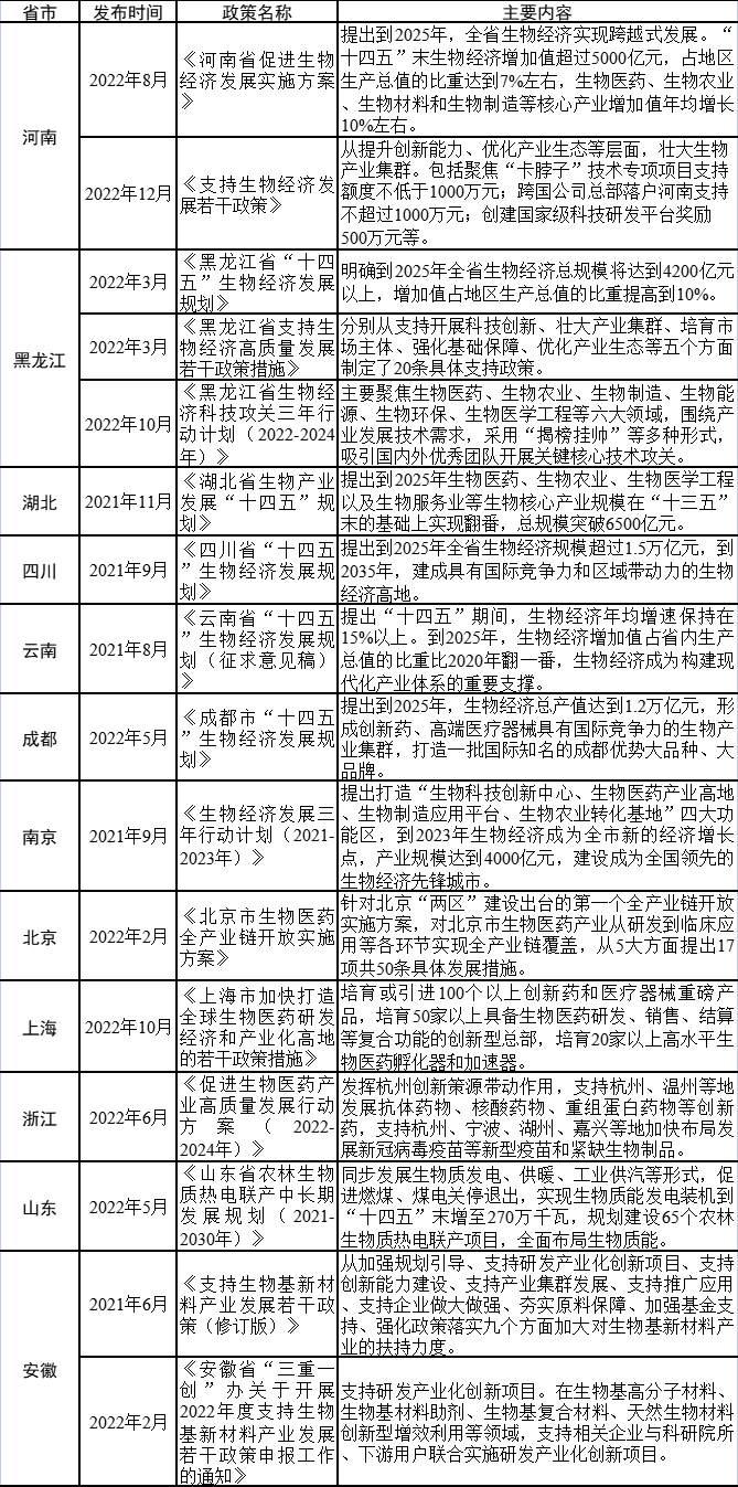 2021年3月,國家“十四五”規劃綱要在“構筑產業體系新支柱”中提出“做大做強生物經濟”;2022年5月,國家發改委正式對外發布了《“十四五”生物經濟發展規劃》,明確到2025年,生物經濟將成為我國推動高質量發展的強勁動力。這是我國首部生物經濟五年規劃,標志著我國正式進入生物經濟新時代。當下我國生物經濟加速發展,進入勃發上升期。國內多省市相繼出臺多項支持政策,大力推進生物經濟發展,著力打造經濟發展的新增長極。