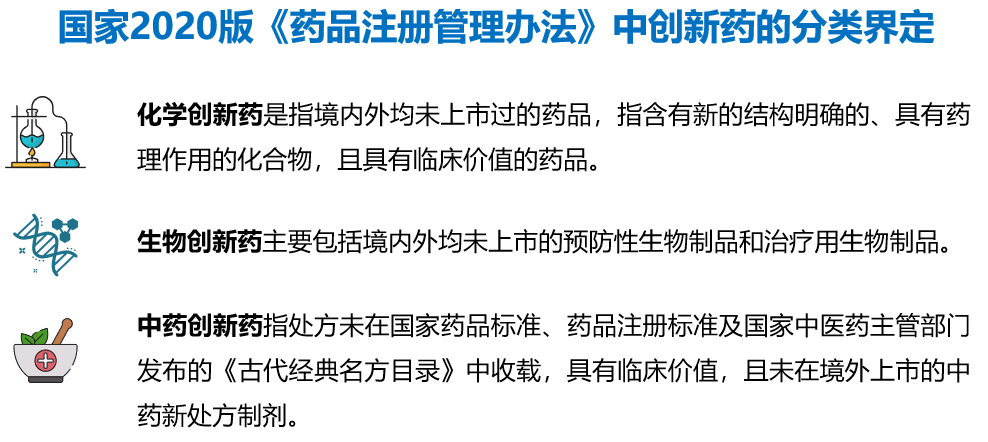 創(chuàng)新藥也稱原研藥,相對于仿制藥而言,是指從機理開始源頭研發(fā),具有自主知識產(chǎn)權(quán),具備完整充分的安全性有效性數(shù)據(jù)作為上市依據(jù),首次獲準上市的藥物。國家2020版《藥品注冊管理辦法》對創(chuàng)新藥進行了分類界定。