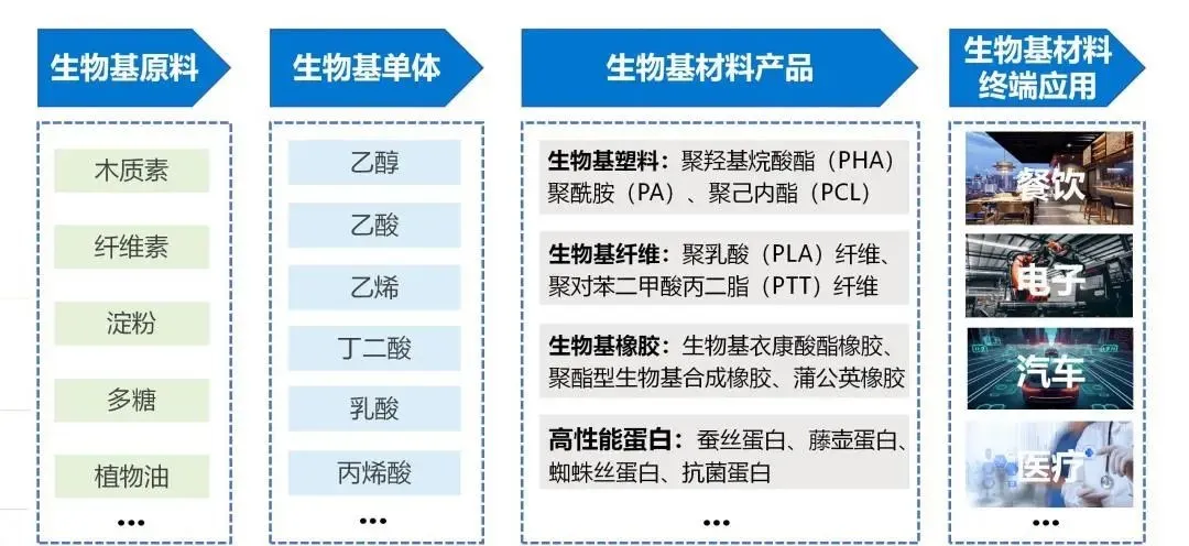 生物基材料已形成涵蓋“原料-單體-材料產品-終端應用”的新型材料產業(yè)鏈。原料層主要涉及生物質資源的收集、加工與轉化,生成植物油、木質素、纖維素、淀粉、多糖等原料。單體層重點是將上游原料經過生物合成、生物加工、生物煉制過程獲得生物醇、有機酸等生物基單體,以及乳酸、丁二酸等生物基平臺化合物,為生物基材料產品制備提供基礎。產品層重點是通過聚合反應和加工過程生產的各種生物基材料,如生物基塑料、生物基纖維、生物基橡膠等。終端應用層則是生物基材料產品的應用場景,涉及醫(yī)療、電子汽車、食品包裝、餐飲等多個領域。