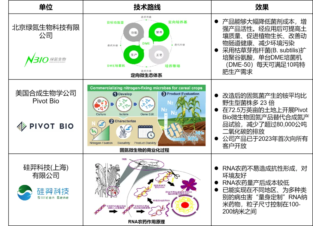 合成生物學(xué)技術(shù)與農(nóng)業(yè)領(lǐng)域的結(jié)合日益緊密,并在部分方向上已有商業(yè)化成果。目前,農(nóng)業(yè)合成生物學(xué)的基礎(chǔ)研究主要集中在人工細(xì)胞合成、細(xì)胞工廠、種質(zhì)改良、二氧化碳固定、生物固氮和農(nóng)業(yè)環(huán)境優(yōu)化等方面,應(yīng)用研究主要集中在植物天然產(chǎn)物開(kāi)發(fā)、農(nóng)作物性狀改良、病蟲害防控、肥料生產(chǎn)、飼料及添加劑制備等方面,目前能夠或接近實(shí)現(xiàn)商業(yè)化的應(yīng)用主要集中在作物育種、固氮肥料、農(nóng)藥生物制造等領(lǐng)域。相比之下,生物固碳、生物固氮和代謝途徑改造等仍處于初期概念階段。