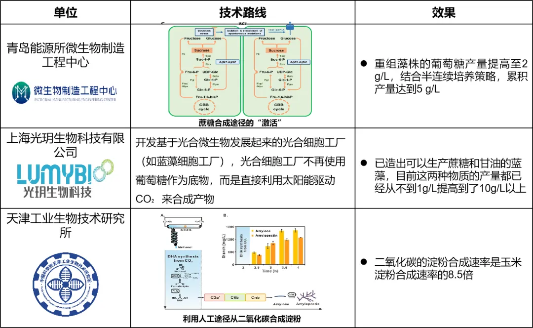 目前國(guó)內(nèi)已有團(tuán)隊(duì)在該領(lǐng)域取得研究進(jìn)展,如青島能源所微生物制造工程中心實(shí)現(xiàn)藍(lán)細(xì)菌直接利用二氧化碳合成葡萄糖;上海光玥生物科技有限公司改造出可以生產(chǎn)蔗糖和甘油的藍(lán)藻;天津工業(yè)生物技術(shù)研究所成功實(shí)現(xiàn)從二氧化碳到淀粉的人工合成,但基本都還處于實(shí)驗(yàn)室概念驗(yàn)證階段。