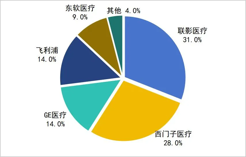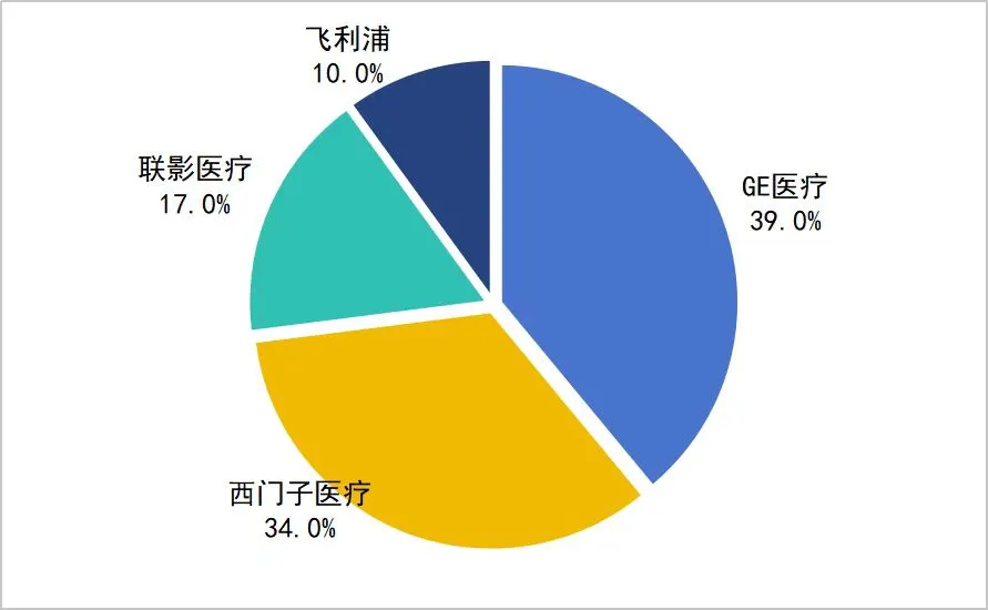 MR主要包括MR(1.5T)和MR(3.0T)兩種。其中,MR(3.0T)以其更高的信噪比、空間分辨率和掃描速度,極大提升了診斷精度,臨床應(yīng)用日益廣泛,占據(jù)MR總體市場超52%的市場份額,且市場份額高度集中,GE醫(yī)療(39%)、西門子醫(yī)療(34%)、聯(lián)影醫(yī)療(17%)三家企業(yè)合計市占率近90%。聯(lián)影醫(yī)療、東軟醫(yī)療加速入局本次醫(yī)療設(shè)備更新,提升MR國產(chǎn)化率,其中東軟醫(yī)療以1.5T產(chǎn)品為主,聯(lián)影醫(yī)療在主導(dǎo)1.5T市場份額的基礎(chǔ)上強勢進軍3.0T市場。
