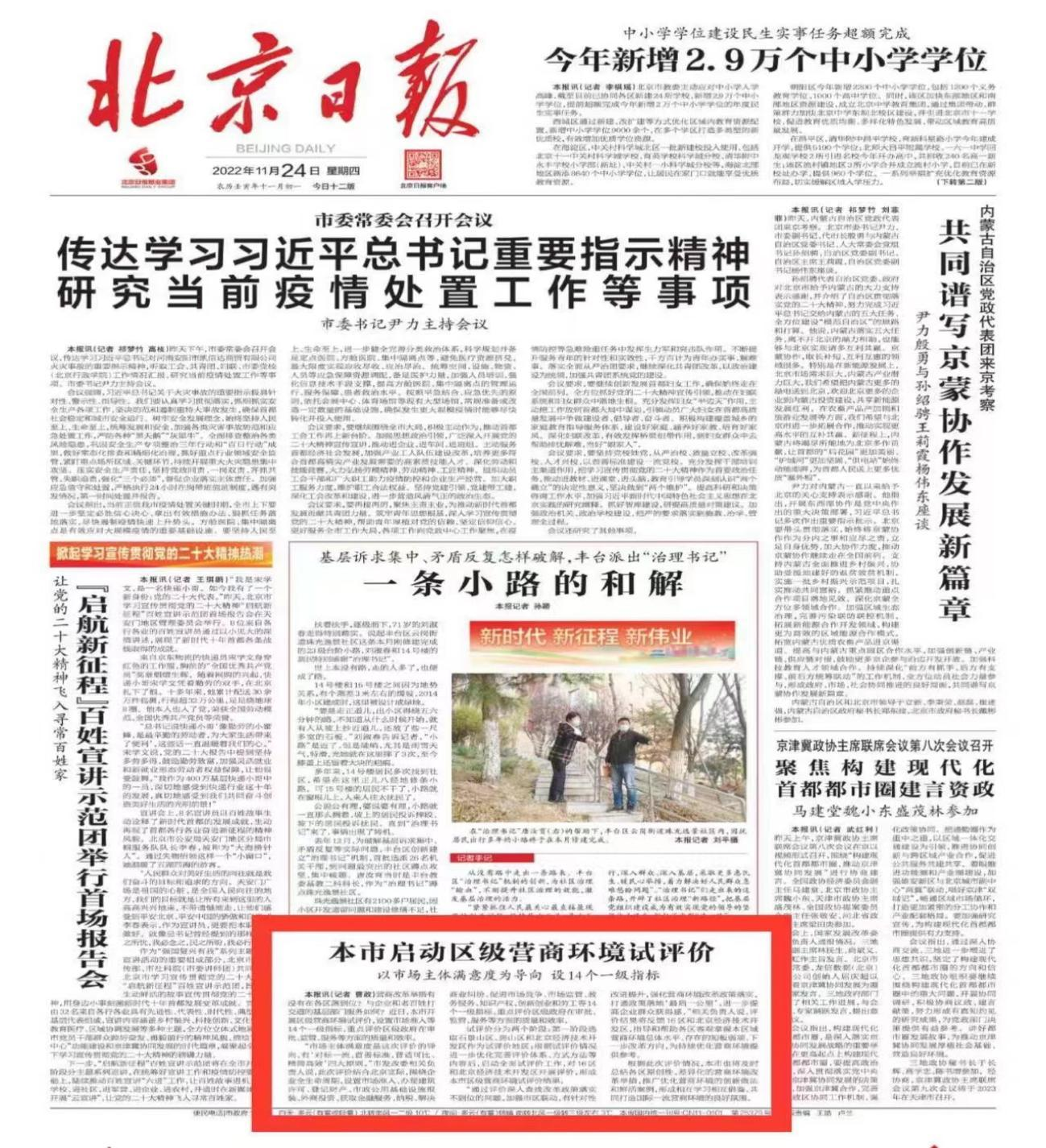 11月24日,北京日?qǐng)?bào)頭版刊登了《全市啟動(dòng)區(qū)級(jí)營商環(huán)境試評(píng)價(jià)》報(bào)道文章。此次全市區(qū)級(jí)營商環(huán)境評(píng)價(jià)工作由北京市發(fā)展改革委負(fù)責(zé)組織實(shí)施,并委托咨詢公司作為評(píng)價(jià)工作的牽頭承擔(dān)單位具體開展實(shí)施。